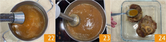 Ajuste o sal e a pimenta do molho 22 e coloque-o de volta no fogo para aquecê-lo. Você pode liquidificá-lo ainda mais com um mixer de imersão para obter uma consistência mais lisa e homogênea 23. Cubra o ossobuco com o molho quente 24.