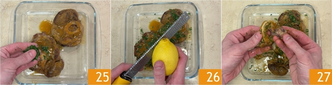 Perfume com a salsinha e o alecrim picados finamente 25 e rale a casca de limão 26, depois deixe esfriar completamente. Uma vez esfriados, retire o tutano 27.