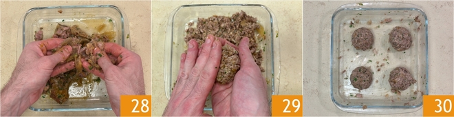 Desfie finamente a carne com as mãos 28 e misture ao tutano para obter uma mistura homogênea. Retire uma parte da mistura e compacte entre as palmas das mãos para formar uma almôndega 29. Você deve fazer 4 almôndegas do mesmo tamanho 30.