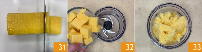 Reserve as almôndegas e retome a polenta, já resfriada. Corte a polenta em cubos grandes 31, depois coloque-os em um mixer 32 e triture para obter uma mistura macia 33.