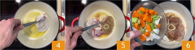 Coloque o ossobuco em uma panela com um pouco de óleo quente (nós usamos uma caçarola adequada para forno, alternativamente você pode transferi-los posteriormente para uma assadeira) 4 e doure em fogo médio por 3 minutos de cada lado 5. Quando estiverem bem dourados, adicione os vegetais 6.