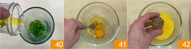 Para o óleo de salsinha, deixe em infusão a salsinha picada no azeite de oliva por pelo menos 5 minutos 40. Enquanto isso, dedique-se ao empanamento e fritura das almôndegas: aqueça o óleo de sementes até a temperatura de 170°. Bata os ovos em uma tigela separada 41 e passe as almôndegas no ovo batido 41.