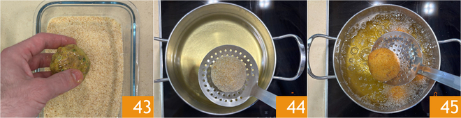 Cubra as almôndegas também com a farinha de rosca 43. Mergulhe 1-2 almôndegas por vez no óleo quente 44 e frite por cerca de 3-4 minutos. Quando estiverem bem douradas, escorra 45 em papel toalha.
