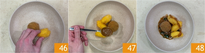 Você está pronto para montar o prato: em cada prato, coloque um croquete de ossobuco e 3 quenelles de polenta 46. Regue com o molho de ossobuco restante 47 e complete com algumas gotas de óleo de salsinha. Sirva imediatamente seus croquetes de ossobuco 48!