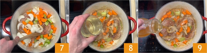 Continue cozinhando em fogo médio por mais 5 minutos 7, depois adicione o vinho branco 8 e deixe evaporar completamente. Neste ponto, adicione o caldo quente 9.