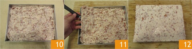 Uma vez obtida uma consistência espessa, transfira a mistura para uma assadeira 10, deixe esfriar à temperatura ambiente e coloque na geladeira para firmar por pelo menos 2 horas. Retire a mistura da geladeira e vire-a sobre uma tábua 11 12.