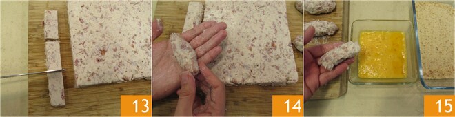 Com uma faca, corte 10 retângulos iguais 13. Dê a forma de um croquete moldando-os com as mãos úmidas. Passe os croquetes primeiro nos ovos batidos 15