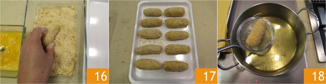e depois na farinha de rosca 16. À medida que os empanar, coloque-os em uma bandeja 17. Aqueça o óleo vegetal e leve-o a 170°. Cozinhe os croquetes por no máximo 3 minutos 2 de cada vez 18.