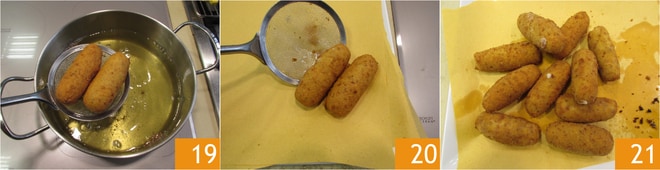 Escorra-os quando estiverem dourados 19 e deixe-os secar em papel absorvente 20. Sirva imediatamente os croquetes de presunto 21.