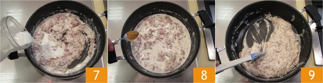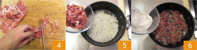 Enquanto isso, corte o presunto em tiras 4, adicione-o à panela 5 e cozinhe por 1 minuto. Adicione a farinha de uma vez só 6 e toste por 2 minutos.