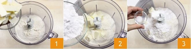 Para preparar a torta de figos e mascarpone, comece pela massa podre. Coloque a farinha em um processador e adicione a manteiga fria em pedaços 1. Adicione também o açúcar de confeiteiro 2 e uma pitada de sal 3, então ligue o processador até obter uma mistura arenosa.