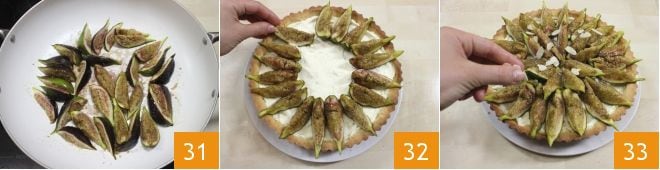 Cozinhe até que atinjam uma consistência macia e caramelizada 31, virando-os muito delicadamente para evitar que se desfaçam e deixe esfriar. Neste ponto, decore a torta posicionando os pedaços de figo em forma de raio 32 e termine com uma pitada de amêndoas laminadas 33. Sua torta de figos e mascarpone está pronta para ser servida e apreciada!