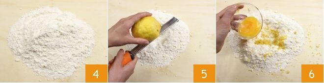 Transfira a mistura para uma superfície de trabalho 4 e faça uma cavidade no centro. Então rale a casca de limão 5 e depois adicione as gemas 6.