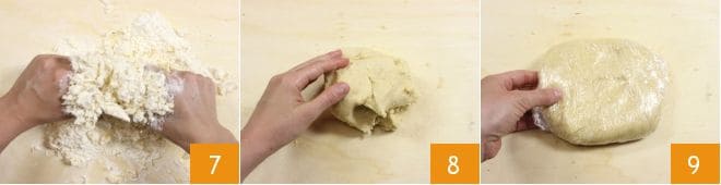 Misture todos os ingredientes, trabalhando a mistura com as mãos 7, até obter uma massa lisa e homogênea 8. Modele a massa, cubra com plástico filme 9 e deixe descansar na geladeira por pelo menos meia hora. Para descobrir como preparar e conservar melhor a massa podre, consulte nossa Escola de culinária: Massa podre.