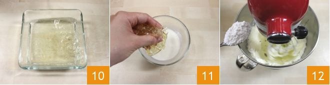 Enquanto isso, prepare o creme de mascarpone: primeiro mergulhe a gelatina em uma tigela com água fria por 10 minutos 10. Após esse tempo, esprema a gelatina e dissolva em 50 ml de creme de leite morno 11. Agora coloque o mascarpone na tigela de uma batedeira ou em uma tigela para então trabalhar com uma batedeira elétrica, e amoleça com o açúcar de confeiteiro 12, lembrando-se de reservar 2 colheres de sopa. Bata apenas por alguns segundos com as pás, caso contrário, pode ficar muito grumoso.