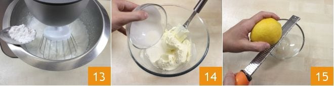 Bata o creme de leite restante com as duas colheres de sopa de açúcar de confeiteiro que você reservou 13. Depois, adicione a mistura de gelatina e creme de leite ao mascarpone 14 e misture bem. Então rale a casca de um limão 15.