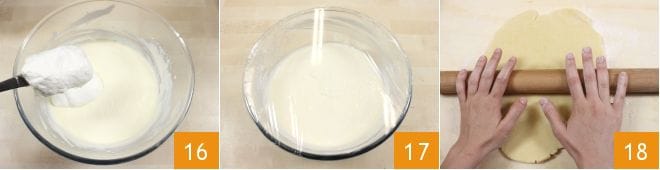 Adicione delicadamente o mascarpone ao creme de leite batido 16 e adicione a casca de limão ralada. Misture tudo com cuidado para incorporar os ingredientes, cubra a tigela com plástico filme e deixe endurecer na geladeira por pelo menos 1 hora 17. Enquanto isso, retire da geladeira o bloco de massa podre e abra-o em uma superfície de trabalho previamente enfarinhada, obtendo uma folha com cerca de 1 cm de espessura 18.