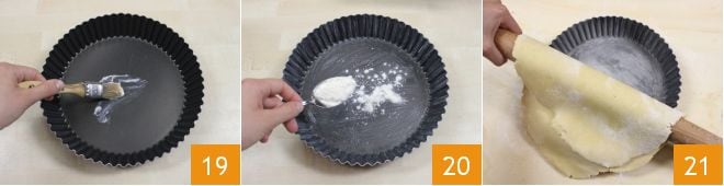 Unte uma forma de torta com diâmetro de 25 cm, ajudando-se com um pincel e enfarinhe-a (19-20). Então, levante a massa podre aberta, enrolando-a no rolo e posicione-a na forma de torta 21. Faça-a aderir bem à forma com as mãos.