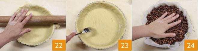 Elimine o excesso de massa, pressionando o rolo nas bordas da forma 22 e fure o fundo da massa podre com os dentes de um garfo 23. Depois, faça o cozimento às cegas: estenda uma folha de papel manteiga no fundo e preencha com feijões secos 24. Asse a forma em forno estático pré-aquecido a 180° por 30 minutos, se usar forno ventilado, asse a 160° por 20 minutos. Para descobrir como fazer o cozimento às cegas da melhor forma possível, consulte nossa Escola de culinária: Como fazer a cocção às cegas.