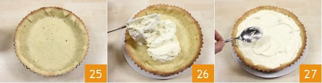 Uma vez assada, retire a massa podre do forno, elimine o papel manteiga e os feijões secos e asse novamente por 5 minutos na mesma temperatura 25, então retire do forno e deixe esfriar completamente. Uma vez resfriada, recheie com o creme de mascarpone 26, que já terá endurecido, nivelando com as costas de uma colher 27.