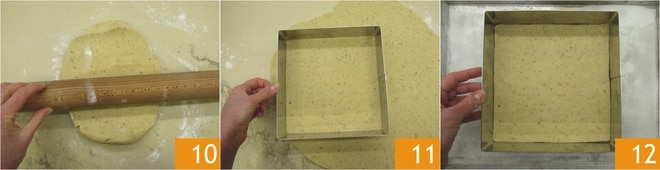 Após o tempo de descanso, abra a massa sobre a superfície de trabalho ligeiramente enfarinhada até uma espessura de cerca de meio centímetro 10. Corte a massa com uma forma quadrada de 21x21 cm 11, depois transfira para uma assadeira forrada com papel manteiga junto com a forma 12.