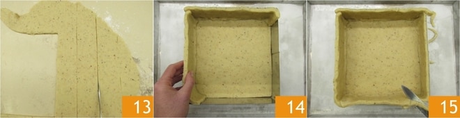 Corte tiras de 5 cm de largura da massa restante 13 e pressione-as nas bordas da forma 14, depois corte o excesso de massa 15. Coloque a assadeira com a base de massa na geladeira e prepare as decorações.