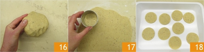 Amasse novamente as sobras de massa 16 e abra-as sempre a uma espessura de meio centímetro, depois corte círculos com um cortador de biscoitos de 6 cm de diâmetro 17. Coloque os círculos obtidos em uma assadeira e leve à geladeira por 5 minutos 18.