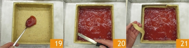 Enquanto isso, retire a base de massa da geladeira e recheie com a geleia de morango 19. Refine a borda da torta com uma faquinha 20 de forma que fique 1 cm mais alta que o nível da geleia 21: desta forma, a geleia não vazará durante o cozimento.