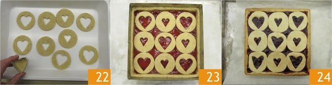 Agora, retire os círculos de massa da geladeira e corte a parte central com um cortador de biscoitos em forma de coração de 4 cm e outro de 3 cm 22. Coloque as formas obtidas sobre a geleia, alternando os dois tipos 24. Asse a torta em forno estático pré-aquecido a 180° por cerca de 40 minutos. Retire do forno e deixe esfriar completamente 24, depois polvilhe com açúcar de confeiteiro. A torta de Dia dos Namorados está pronta para ser cortada em quadrados e saboreada junto com seu amor!