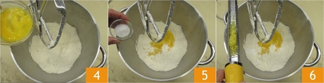 Ligue novamente a batedeira por mais alguns minutos, depois adicione os ovos em temperatura ambiente 4, o sal 5 e a casca de limão ralada 6.