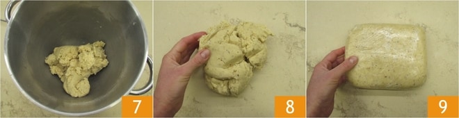Trabalhe por mais 2 minutos para compactar os ingredientes 7, depois transfira a mistura para a superfície de trabalho e manuseie brevemente para formar uma bola, evitando, assim, que se forme a rede de glúten que tornaria a massa pouco crocante 8. Envolva a bola em filme plástico 9 e deixe descansar na geladeira por pelo menos uma hora.