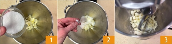 Para preparar a torta mimosa, comece pela massa amanteigada: na tigela da batedeira equipada com a pá, coloque a manteiga em cubos, retire da geladeira 5 minutos antes, o açúcar 1 e uma pitada de sal 2. Ligue a batedeira para misturar rapidamente 3.
