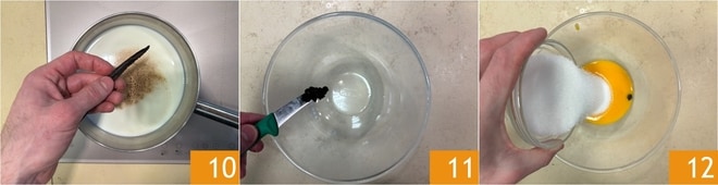 Para preparar o creme de confeiteiro, extraia as sementes da fava de baunilha, depois leve ao fogo o leite com as raspas de limão, a fava, uma pitada de canela em pó e uma pitada de sal 10. Enquanto isso, em uma tigela, junte as sementes de baunilha 11, as gemas e o açúcar 12.
