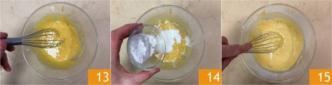 Misture com o batedor de arame 13, depois incorpore o amido de milho e o amido de arroz 14 e misture bem 15.