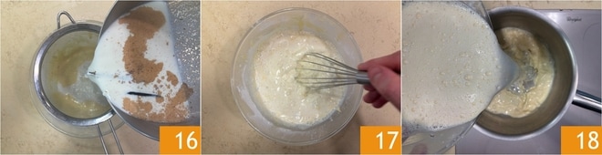 Quando o leite ferver, coe diretamente na tigela com a mistura de gemas e açúcar 16 e misture com um batedor de arame 17. Transfira a mistura para uma panela de fundo duplo 18.