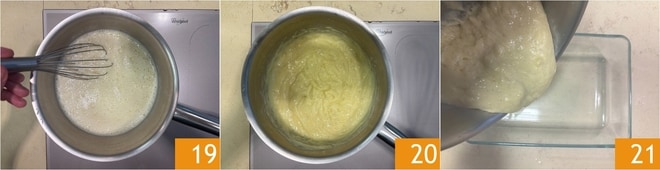 Cozinhe o creme em fogo médio, mexendo constantemente 19, até engrossar 20. Despeje o creme em uma assadeira 21, cubra com filme plástico em contato e deixe esfriar à temperatura ambiente por 30 minutos. Depois, transfira para um saco de confeiteiro sem bico e coloque na geladeira por pelo menos 3 horas.