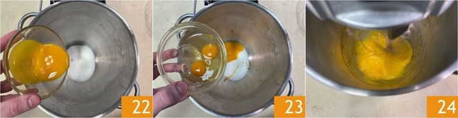 Para preparar o pão de ló, coloque na batedeira, equipada com batedores elétricos, o açúcar, as gemas 22, os ovos inteiros 23 e uma pitada de sal. Bata por pelo menos 10 minutos 24.