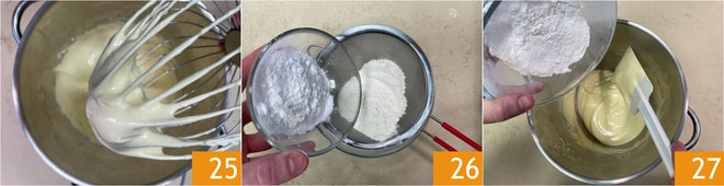 Você deve obter uma mistura clara e espumosa 25. Em uma tigela separada, peneire a farinha e o amido algumas vezes 26, depois incorpore os pós aos poucos à mistura batida, mexendo delicadamente com uma espátula de baixo para cima para não desmontar 27.