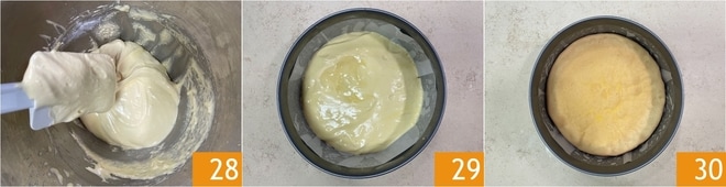 A massa está pronta 28. Forre uma forma de 25 cm de diâmetro com papel manteiga e despeje a massa dentro 29. Asse em forno estático pré-aquecido a 175-180° por cerca de 18 minutos. Faça o teste do palito: se sair seco, o pão de ló está pronto. Retire do forno 30 e deixe esfriar à temperatura ambiente.