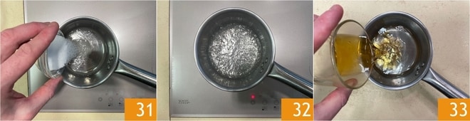 Para preparar a calda, coloque em uma panela a água e o açúcar 31, depois leve à fervura 32. Retire do fogo e deixe esfriar completamente. Uma vez que o xarope esteja frio, adicione o rum 33 e misture.
