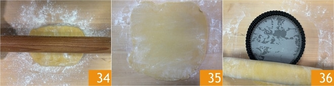 Depois que a massa amanteigada descansou na geladeira, estenda com o rolo em uma superfície de trabalho enfarinhada 34 até atingir uma espessura de cerca de 5 mm 35. Unte e enfarinhe uma forma de 25 cm de diâmetro, com pelo menos 3,5 cm de altura, e forre-a com a massa amanteigada, enrolando-a primeiro no rolo e depois desenrolando na forma 36.