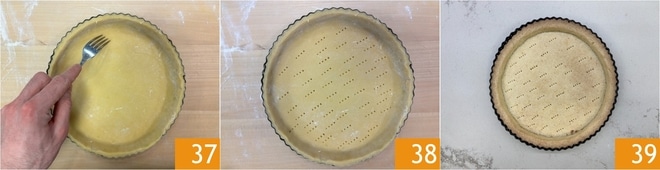 Pressione a massa no fundo e nas bordas, depois corte o excesso e fure o fundo com um garfo 37. Asse em forno estático pré-aquecido a 175° por cerca de 30 minutos 38. Depois de assada, deixe esfriar completamente a base 39.