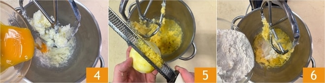 Adicione as gemas 4 e as raspas de limão 5, misture bem, depois incorpore a farinha 6 e continue amassando.