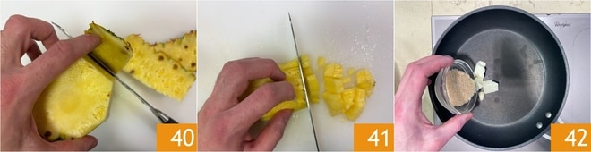 Limpe o abacaxi e extraia 200 g de polpa 40, depois corte em pequenos cubos 41. Em uma panela, derreta a manteiga e o açúcar mascavo 42.