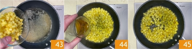 Adicione o abacaxi 43, adicione o rum 44 e cozinhe em fogo baixo até ficar levemente caramelizado 45.