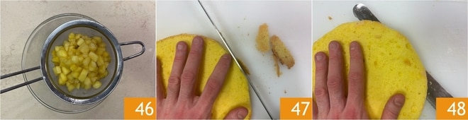 Escorra os cubos de abacaxi e deixe esfriar completamente 46. Enquanto isso, com uma faca serrilhada, remova a casquinha externa do pão de ló 47. Divida o pão de ló horizontalmente ao meio para obter um disco de 1 cm de espessura 48.