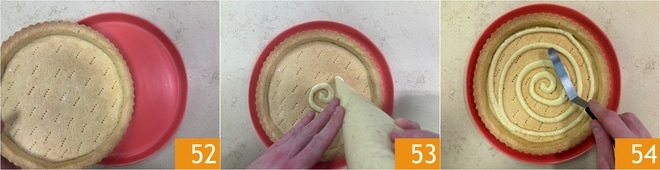 Coloque a base de massa amanteigada resfriada em uma bandeja de servir 52, depois distribua metade do creme de confeiteiro no fundo 53 espalhando com uma espátula 54.