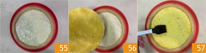 Você deve obter uma camada homogênea 55. Pincele com a calda um lado do segundo disco de pão de ló, com 1 cm de espessura, coloque-o sobre o creme, com o lado umedecido voltado para baixo 56, depois pincele com a calda de rum também do outro lado 57.