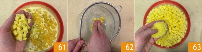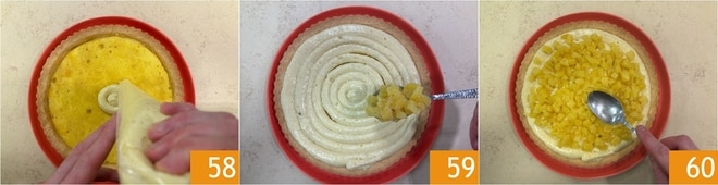 Distribua o creme de confeiteiro restante 58, depois adicione os cubos de abacaxi caramelizado 59 e nivele tudo com as costas de uma colher 60.