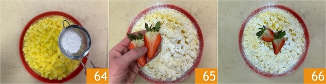 Complete com o açúcar de confeiteiro 64 e um morango fresco cortado ao meio 65. Deixe descansar na geladeira por pelo menos 2 horas antes de servir sua torta mimosa 66!